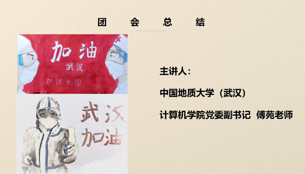 最后,傅苑老师温情寄语计科学子,她首先表达对同学们的思念和牵挂,并对同学们不计个人安危,积极投身抗疫志愿活动的行为给予充分肯定和高度赞扬。希望广大同学能够继续发扬计科人能拼搏、勇担当的精神,做一个有责任感、有温度、高度自律的人,在生活和学习中严格遵守制度,恪守规矩,珍惜当下,孝顺父母,制定目标,主动作为,在关键时刻发光发热,用自己的担当去影响周围的人。
